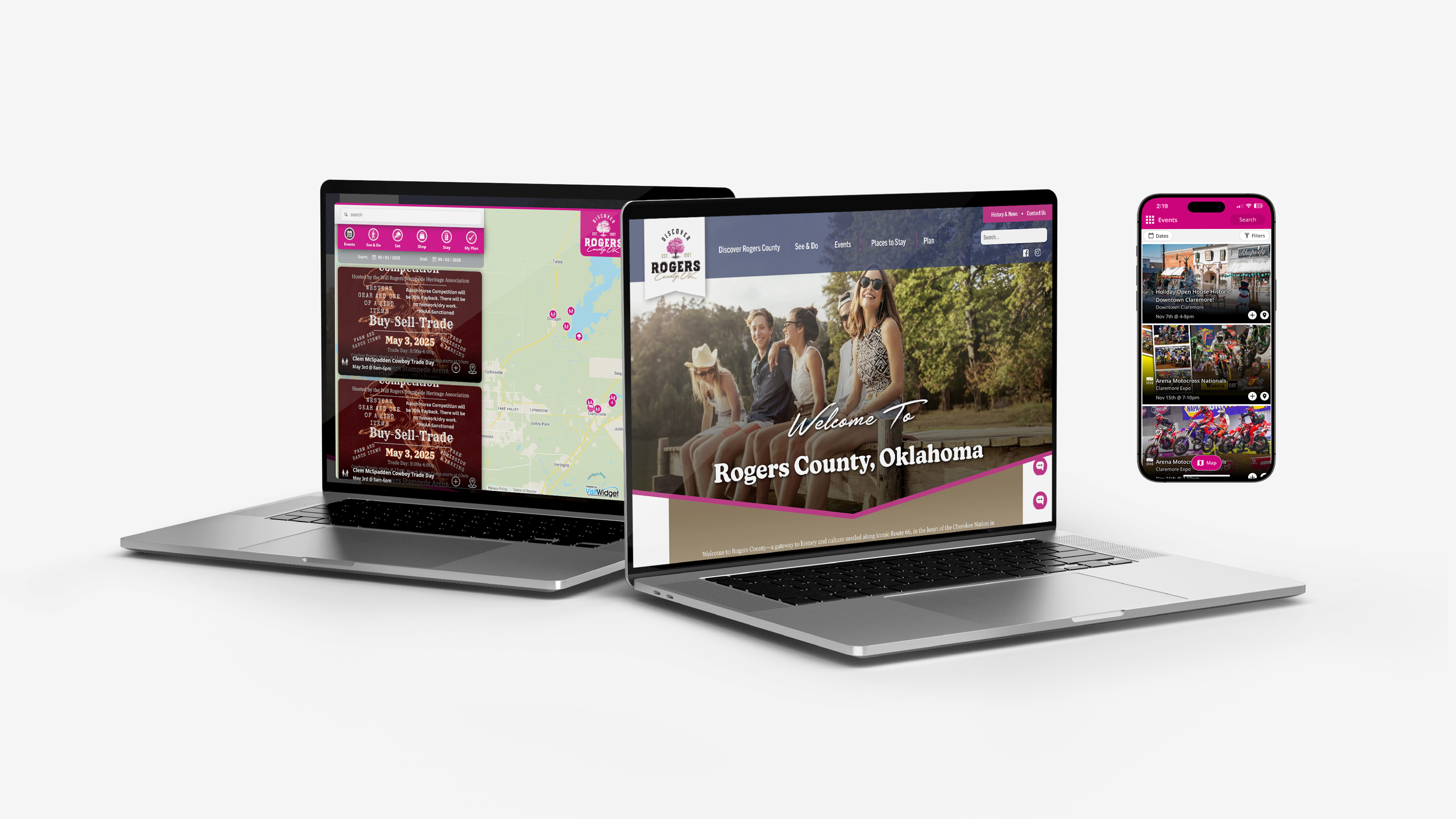 Our Approach: Discover Rogers County launched in December 2023 as a tourism-focused brand designed to entice visitors and highlight the unique amenities and landmarks of the area. Market and community research informed our creative approach, which included a fresh name, logo, visuals and messaging. A new website, discoverrogerscounty.com, accompanies social media channels and travel guides, each providing guests with an in-depth look at Rogers County’s activities, restaurants, events and more. To help visitors plan their trip with maps, travel tips and real-time updates, an interactive app was integrated into the website and is now available through the Apple and Google app stores.